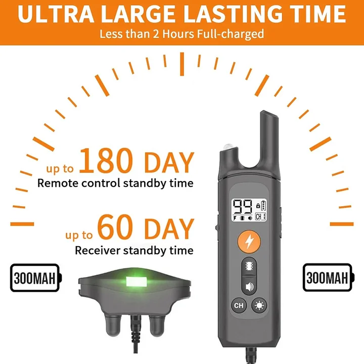 - LONG STANDBY TIME- The 300hAm lithium battery gives the training collar a long standby time, the smart power saving mode allows the remote control to standby up to 180 days and the receiver to standby up to 60 days, the long-lasting battery life allows you to enjoy long trips and camping trips with your dog and a long holiday with your beloved pet!