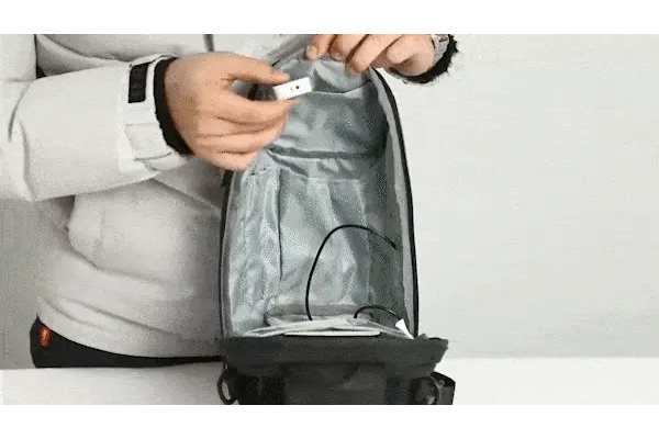 USB-A port & cable connect to portable charger inside the bag
