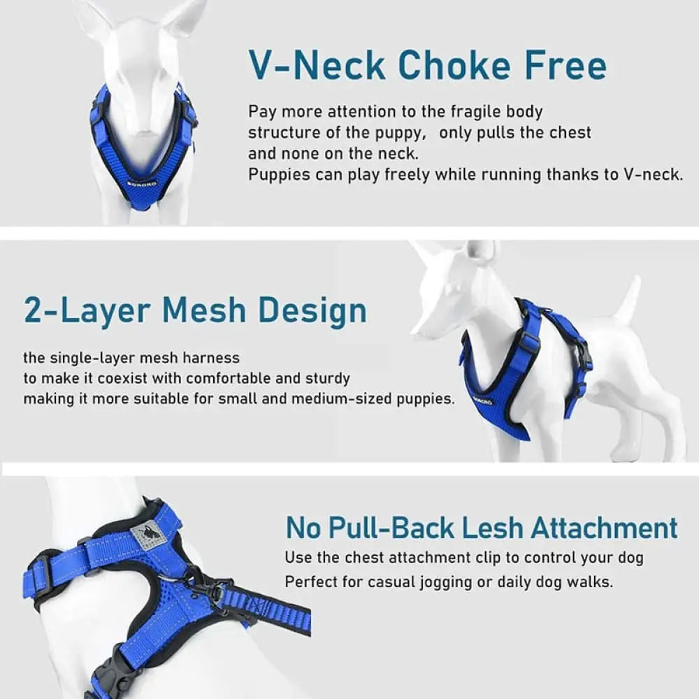 • No, Pull & Choke Free - Durable fully welded D-Ring for quick and easy leash attachment. Our soft harness provides ultra comfort on the dog's chest and neck area during daily walks. Widened straps make pulling pressure evenly distributed to prevent pulling and choking.