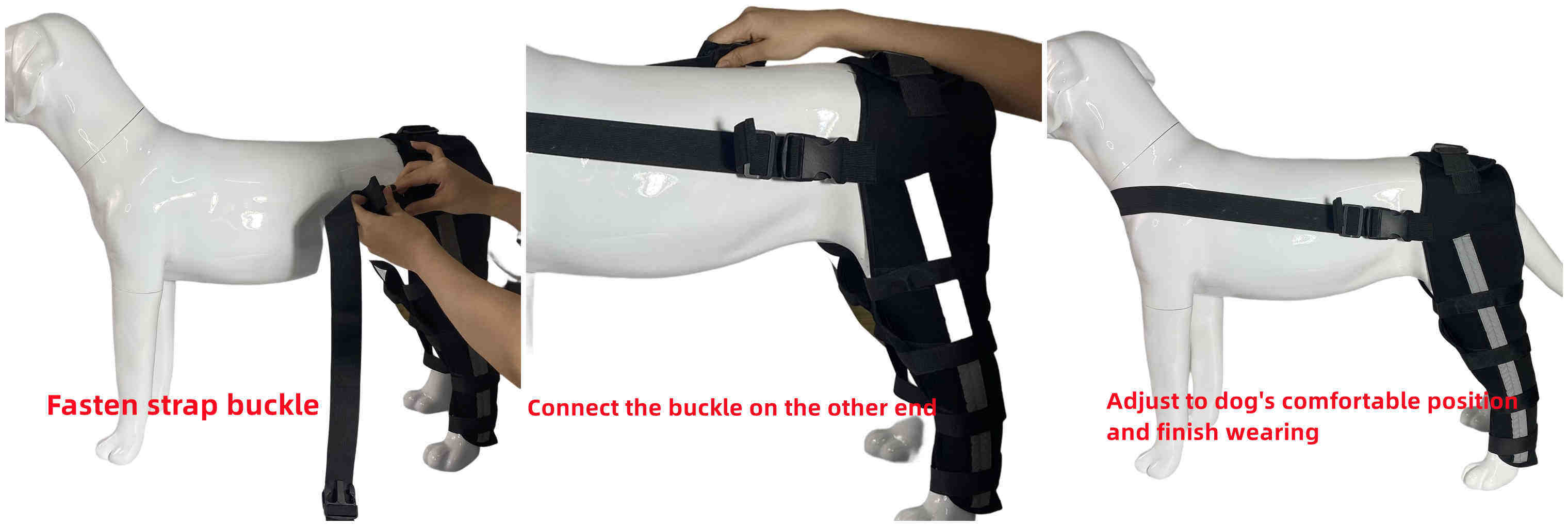 - Attach the buckle on the hip to keep the brace from slipping and adjust it to a comfortable position for the dog
