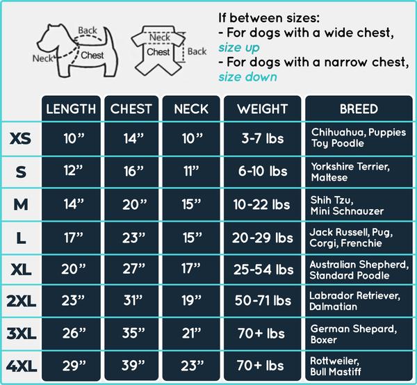 Please measure your pet's chest girth and back length when picking your size. You can use the weight chart and breed list as an estimate, but it does not guarantee a good fit.