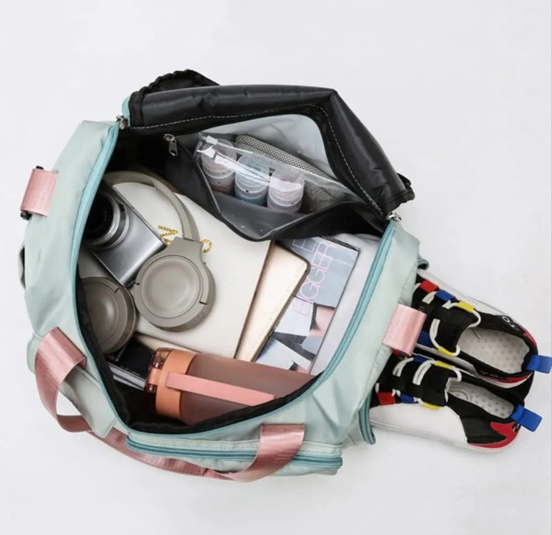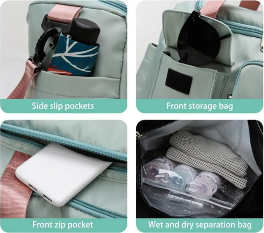 The bag comes with multiple pockets, including a main compartment, wet pocket, shoes compartment and internal pocket. This allows you to keep your belongings organized and easily accessible.