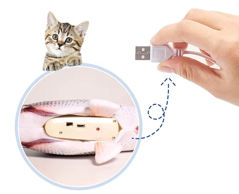 this toy is USB chargeable which saves you from the hassle and costs to replace batteries. USB cable is included in the package. The infused chargeable motor is detachable for convenient cleaning of the plush toy. Use Instructions: Unzip the fish belly, flip the switch on, and then tap the fish belly to make the fish flop.