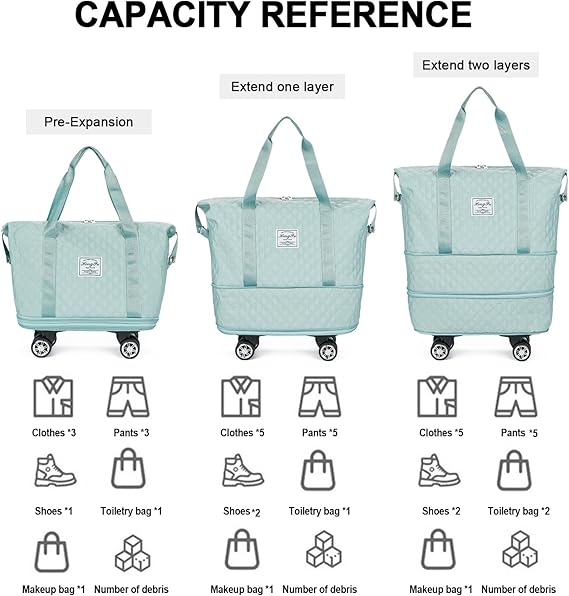 There are two ways to use this flodable travel bag expandable. the first is to use the 28 l bag as a shoulder bag or handbag for daily use. the second is to install wheels on the four grooves at the bottom of the bag, and open the first zip to transform it from an everyday 28 l backpack to a large-capacity 43 l carry-on bag. the second zip expands to a 58 l suitcase, which can be used to carry more luggage on extended trips.