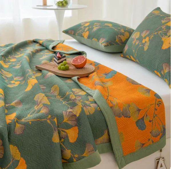 The reversible design quilt with ginkgo leaf Jacquard and bright color options allows you to change the look of your room in an instant. Adopted with reactive printing and jacquard technology. This quilt is suitable as a daily blanket for summer or a bedsheet on your bed. It also can be used as an air conditioning blanket, airplane blanket, bedside towel, sofa blanket, shawl blanket.