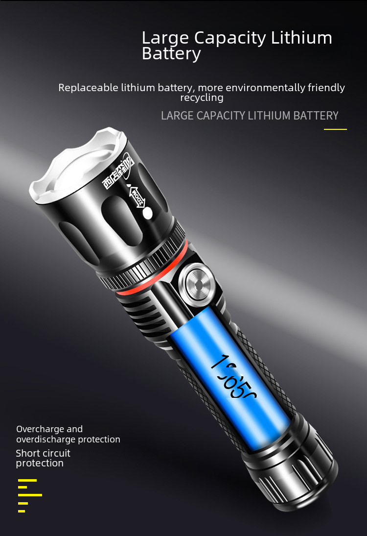 High Battery Capacity: Powered by 18650 lithium batteries, this flashlight boasts a high battery capacity, ensuring long-lasting performance.
