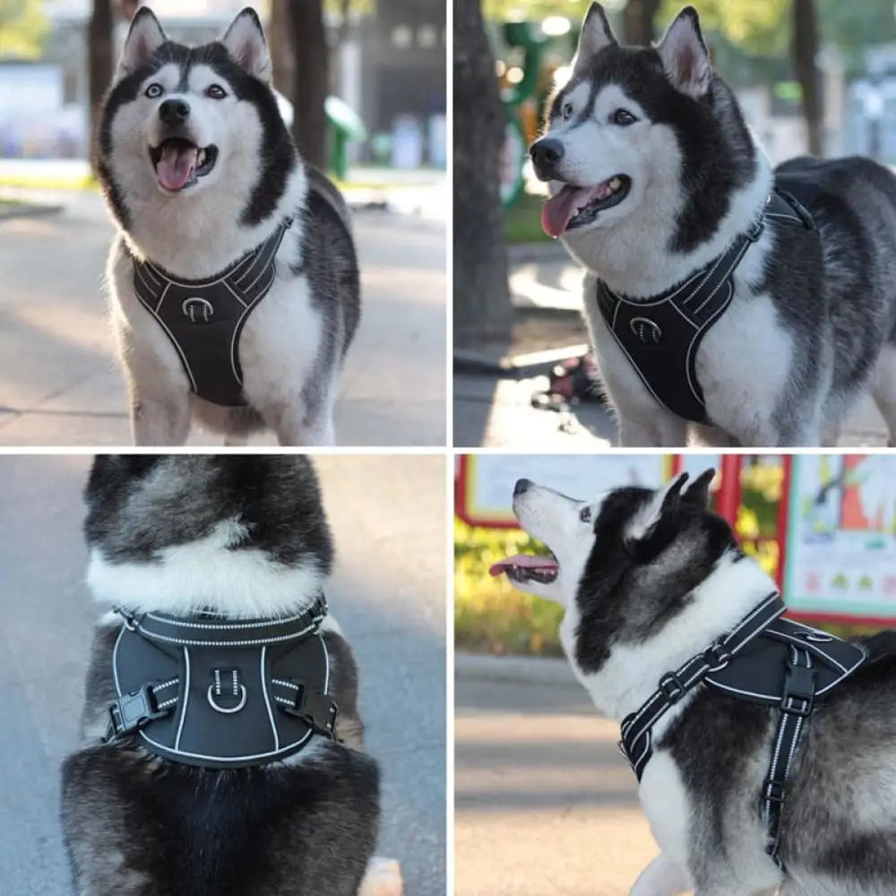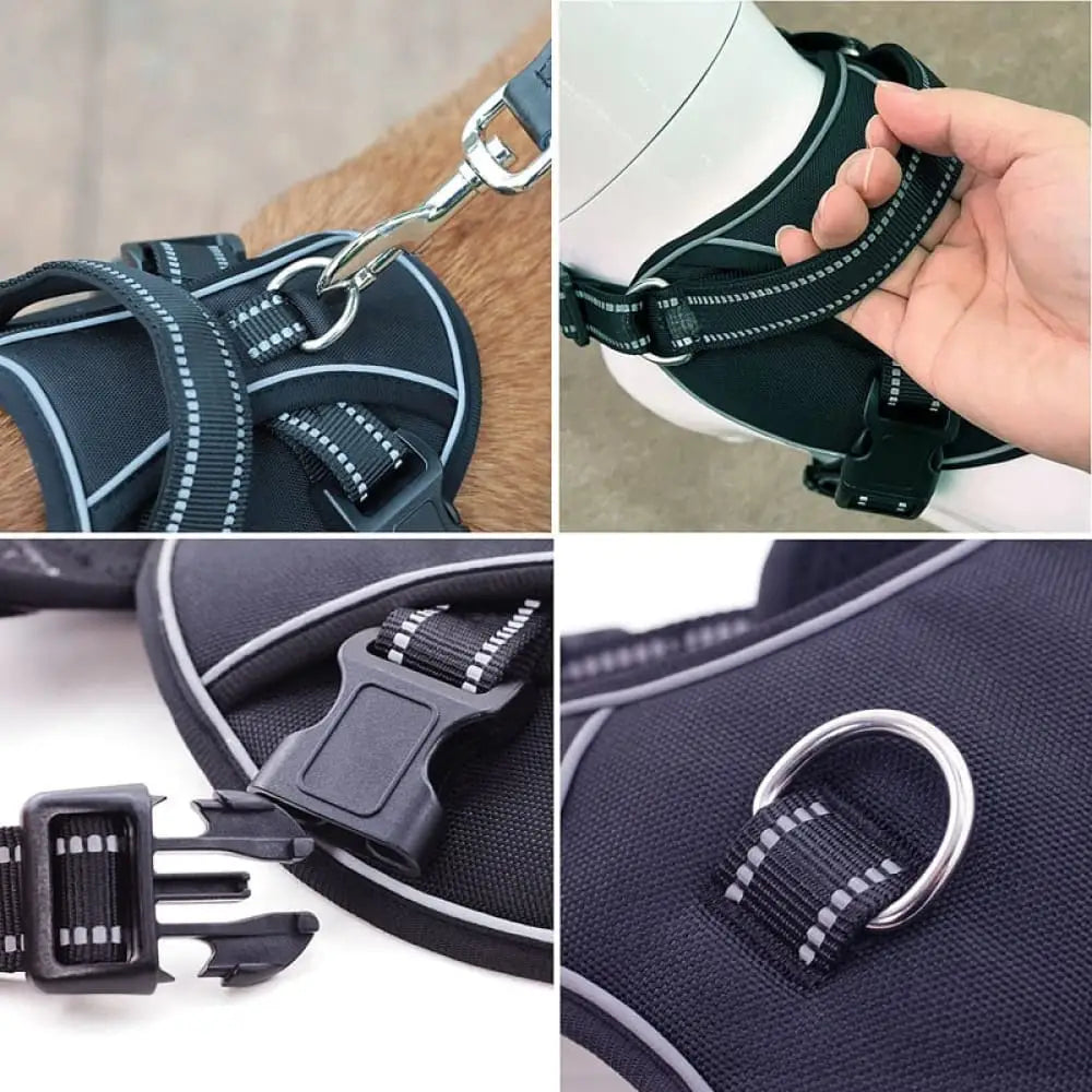 • Fully Adjustable - This adjustable harness features 4 easy-adjusting straps (2 around the neck, 2 around the chest) to adjust the dog harness. Slide the adjuster and pull/push the straps through the adjuster to create a good fit.