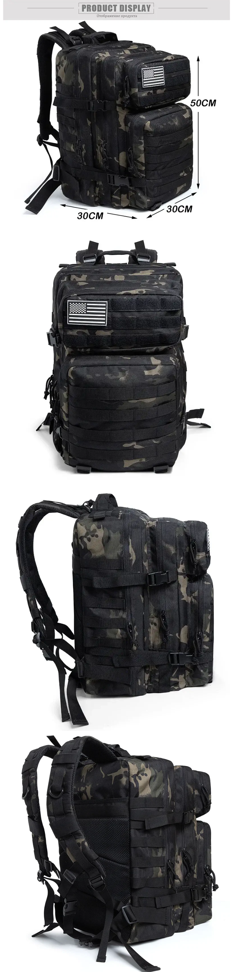Molle backpack webbing system on front and sides, designed to be used in combination with other equipment, you can attaching extra pouches or gears as tactical backpack; such as kettle pouch, walkie-talkie pouch, first-aid pouch, torch pouch, sundries pouch and also the sleeping bag and mat.