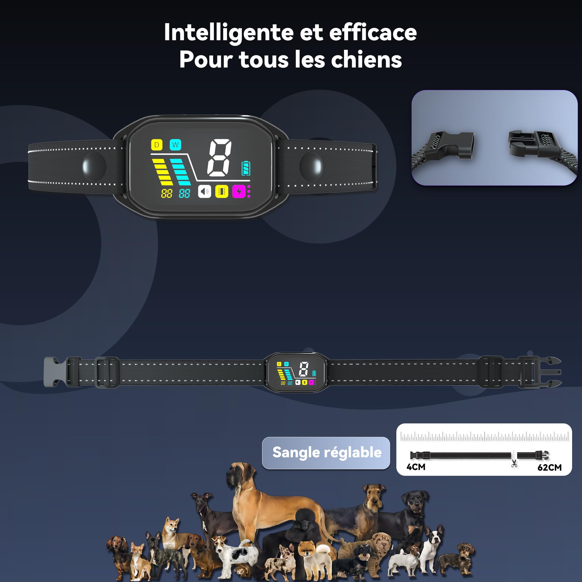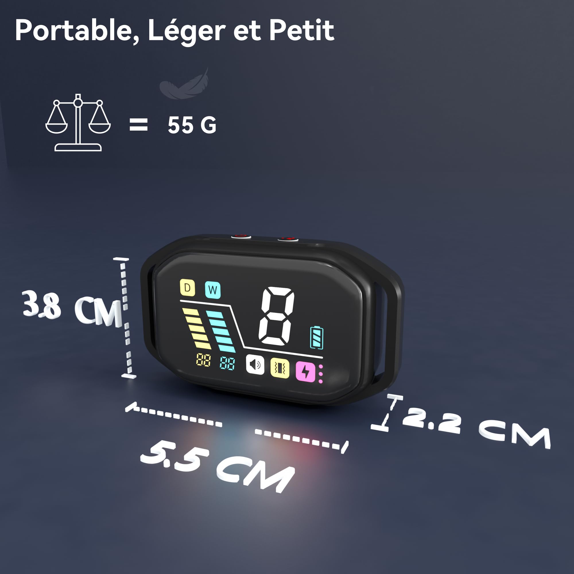 Portable, light and small: Weighing only 55 g, the collar is lightweight and your dog will not even notice its presence. The 62 cm reflective strap is ideal for dogs over 3 kg. The LED colour screen allows you to know the level, the activated mode and the battery status.