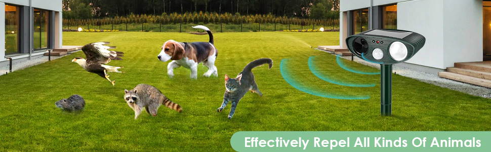 Detects motion and triggers the ultrasonic speaker to produce a tone that humans cannot hear to drive unwanted creatures away. This repeller is effective in a large area of up to 2425 square feet. Since it is powered by solar. No batteries or electricity is needed. And it is perfectly suitable to use in the garden, yard, and lawn, don't hesitate to get one!