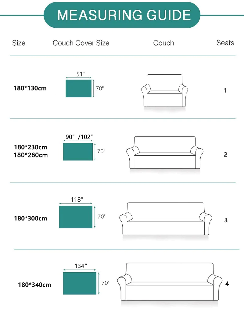 - 180*230cm/ 70×90",180*260cm/ 70×102": Fit loveseat, 2 cushion sofas;