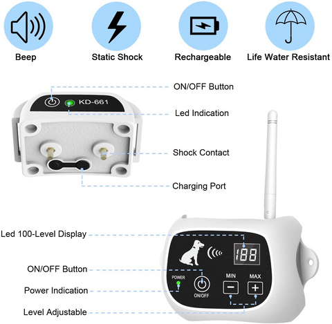 Wireless Dog Fence works by automatically alarming your dog if they try to run away and give them a safe correction shock if they escape the Wireless Electric Dog Fence. The intensity of the correction shock increases as the dog moves away from the safe area, leaving them no choice but coming back home. The correction is designed to interrupt undesirable behavior but never to harm them.