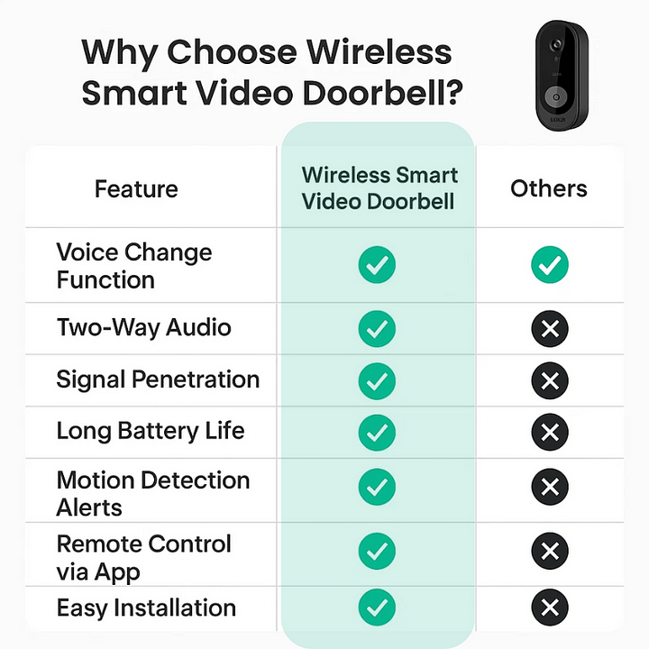 Rental Properties Needing Non-Permanent Solutions: For renters who need effective security without permanent installation, our Wireless Smart Video Doorbell is the ideal choice. Easy to mount and remove without causing damage, it offers a secure, hassle-free solution for any rental space.